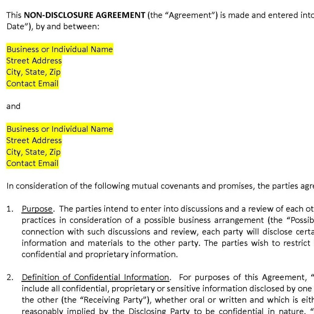 The Non-Disclosure Agreement, also known as an “NDA,” is one of the most valuable templates you’ll have as a business owner. As an entrepreneur, you’ll work with many potential business partners (joint ventures, collaborators, affiliates), employees and independent contractors (developers, designers, assistants, consultants).